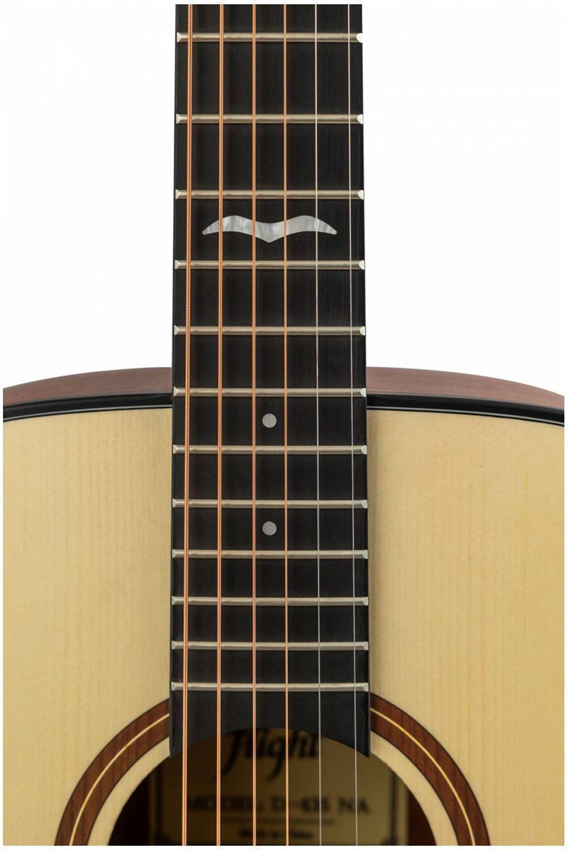 Акустическая гитара Flight D-435 NA - имеет верхнюю деку из шпона ели, но не стоит относиться к этому предвзято - шпон гораздо менее капризен и подвержен влиянию влаги и температуры, что не маловажно в условиях сухового российского климата, особенно в отопительный сезон.